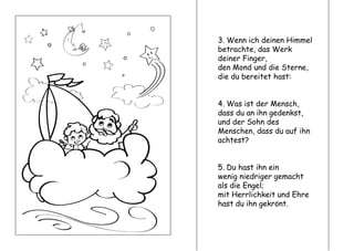 Das Dokument ist eine Lobpreisung Gottes und reflektiert über die Größe seines Schöpfungswerkes und die Stellung des Menschen innerhalb dieser Schöpfung. Es bespricht, dass der Mensch durch Gottes Gnade und Herrlichkeit gekrönt ist und die Herrschaft über die Erde und ihre Kreaturen erhielt. Am Ende wird auf die Schöpfung des Menschen nach dem Bild Gottes verwiesen.
