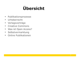 Das Dokument beschreibt den Prozess des Open Access-Publizierens, einschließlich der Abgabe, des Peer-Review-Verfahrens und der Veröffentlichung von wissenschaftlichen Arbeiten. Es erläutert die rechtlichen Aspekte wie Urheberrecht und die Rolle von Creative Commons sowie die Bedeutung von Open Access für den freien Zugang zu Forschungsergebnissen. Zudem werden die Vorteile, Herausforderungen und Möglichkeiten zur Selbstvermarktung von Wissenschaftlern im Digitalzeitalter behandelt.