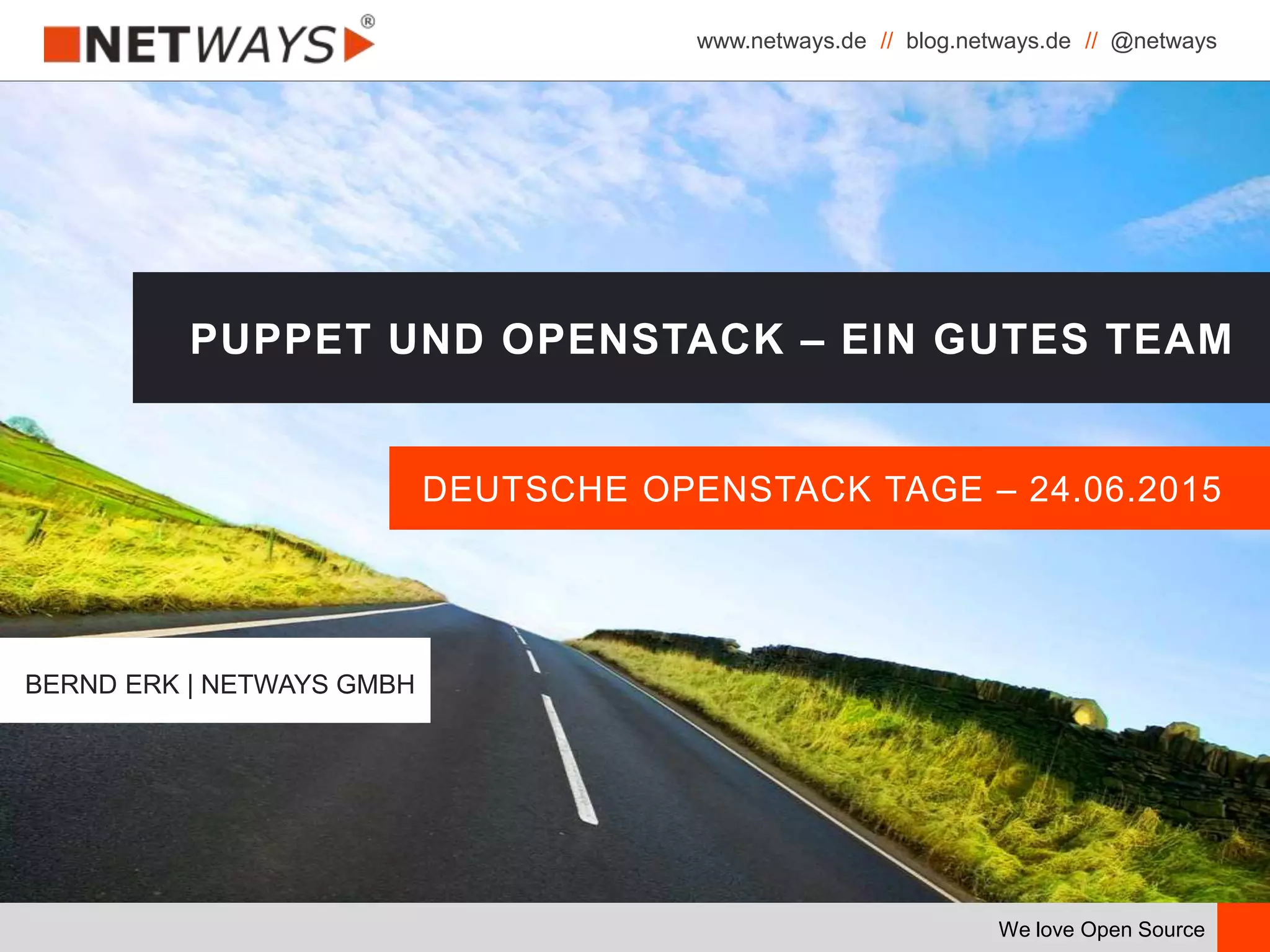 Das Dokument stellt die Zusammenarbeit von Puppet und OpenStack vor, betont die Vorteile von Konfigurationsmanagement und beschreibt die Funktionen sowie die Integration von Puppet in die OpenStack-Umgebung. Es erläutert die Struktur der Puppet-Domainspezifischen Sprache (DSL) und bietet Einblicke in verschiedene OpenStack-Komponenten, die mit Puppet konfiguriert werden können. Eine Zusammenfassung hebt die Herausforderungen und Unterstützung für automatisiertes Deployment durch Puppet hervor.