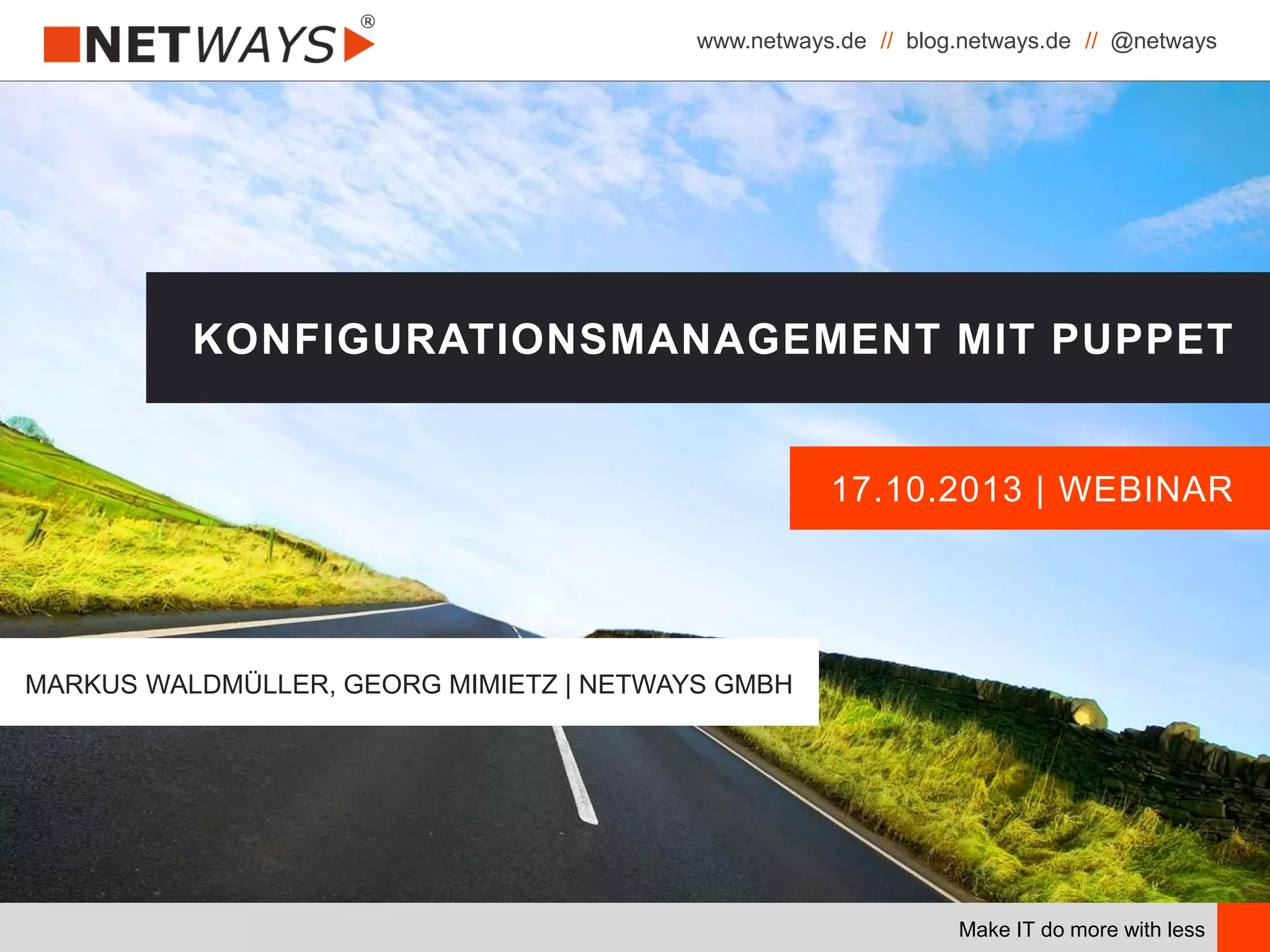 Das Dokument beschreibt ein Webinar über Konfigurationsmanagement mit Puppet, das von Netways durchgeführt wird, und bietet eine detaillierte Übersicht über das Unternehmen, seine Dienstleistungen, Kompetenzen sowie die Architektur und Funktionsweise von Puppet. Es hebt die Vorteile von Konfigurationsmanagement hervor und stellt auch unterstützende Tools wie Foreman und das Puppet Dashboard vor. Außerdem werden die Unterschiede zwischen der Open Source- und der Enterprise-Version von Puppet erläutert.