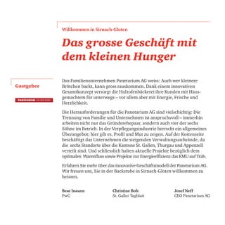 Die Panetarium AG ist ein Familienunternehmen, das sich auf hausgemachte Zwischenverpflegung spezialisiert hat und sechs Standorte in der Schweiz betreibt. Es hat mit Herausforderungen zu kämpfen, wie der Trennung von Familie und Betrieb sowie steigenden Kosten, und verfolgt gleichzeitig innovative Projekte zur Effizienz und Warenfluss. Das Unternehmen hat sich zum Ziel gesetzt, seinen Kunden qualitativ hochwertige Produkte in transportfreundlichen Verpackungen anzubieten.