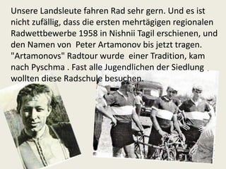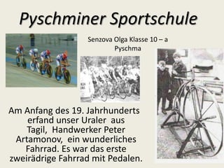 Das Dokument beschreibt die Geschichte der Fahrradschule in pyschma und hebt die Erfolge des Sportlers Nikolai Fjodorowitsch Iwkin hervor, der in den 1970er Jahren als Radrennfahrer bekannt wurde. Er begann als Schüler in der Fahrradschule und entwickelte sich schnell zu einem regionalen Champion, bevor er als Trainer zurückkehrte und viele erfolgreiche Schüler ausbildete. Iwkin bleibt eine inspirierende Figur, die andere motiviert, Sport zu treiben.