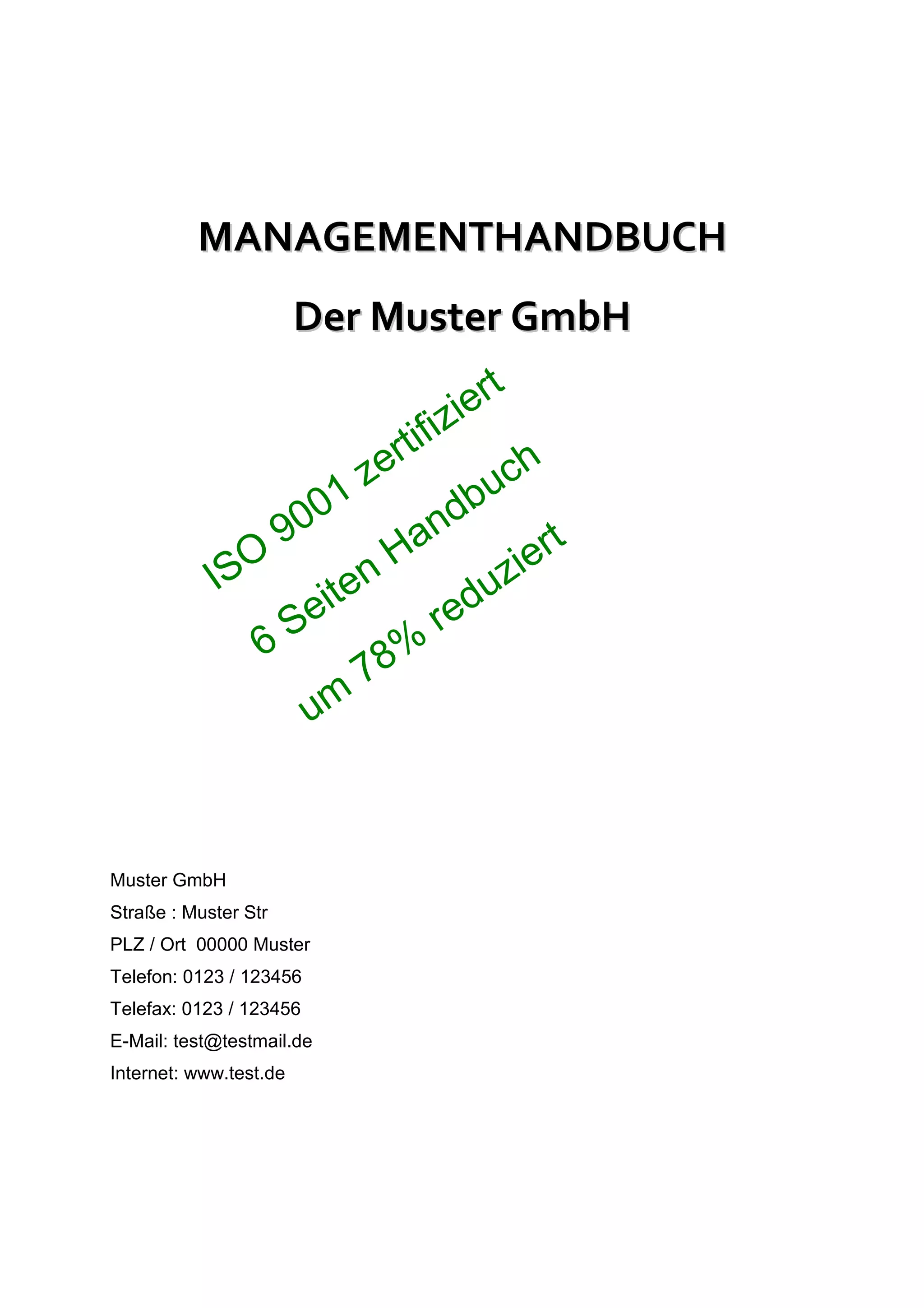 Das Managementhandbuch der Muster GmbH beschreibt die Umsetzung der ISO 9001:2008 und die Verpflichtung zur kontinuierlichen Verbesserung des Qualitätsmanagementsystems. Es betont die Bedeutung von Kundenzufriedenheit, null Fehler bei der Produktion und die Verantwortung aller Mitarbeiter für die Qualität der Produkte. Zudem werden Prozesse zur Überwachung und Verbesserung der Qualität, einschließlich interner Audits, und die Notwendigkeit regelmäßiger Mitarbeiterschulungen hervorgehoben.