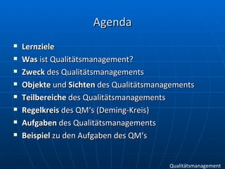 Das Dokument behandelt die Grundlagen des Qualitätsmanagements (QM), einschließlich seiner Definition, Ziele und Teilbereiche. Es beschreibt den Regelkreis des Qualitätsmanagements nach Deming sowie die Aufgaben, die das QM umfasst, um Qualität zu planen, zu steuern, zu prüfen und zu verbessern. Ein besonderes Augenmerk liegt auf der Einbeziehung aller Mitarbeiter und der Sicherstellung von Kundenzufriedenheit und langfristigem Unternehmenserfolg.