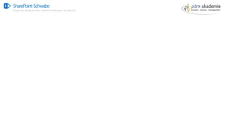 Das Dokument bietet Informationen zu Schulungsangeboten von SharePoint-Schwabe, einschließlich Präsenzschulungen, Workshops und E-Learning. Es richtet sich an verschiedene Zielgruppen wie Anwender, Administratoren und Entwickler. Zudem wird die Möglichkeit zur Kontaktaufnahme für Feedback und Themenwünsche erwähnt.