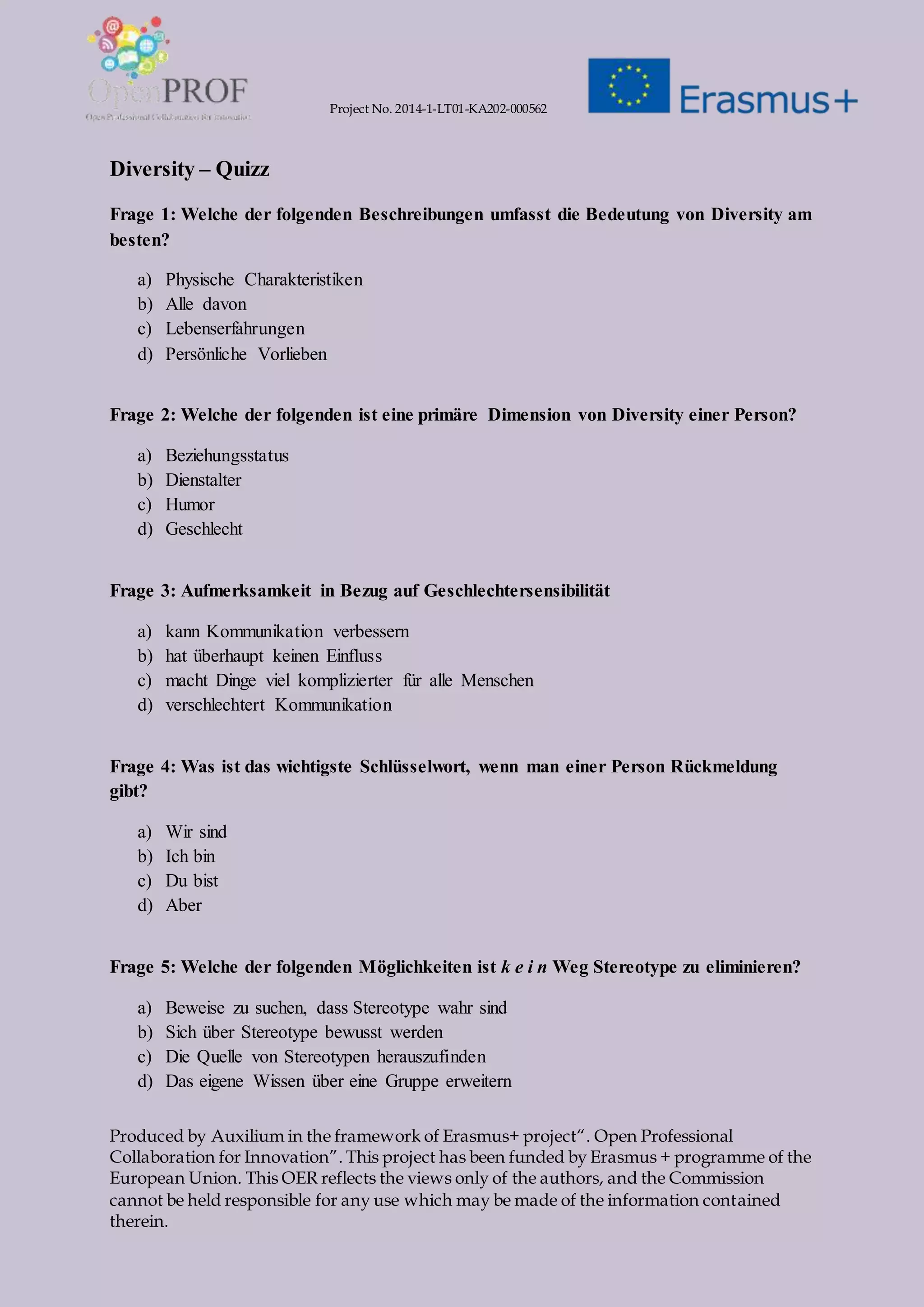 Das Dokument beschreibt ein Projekt im Rahmen von Erasmus+, das sich mit dem Thema Vielfalt (Diversity) befasst und Quizfragen zu verschiedenen Aspekten von Diversity enthält. Es werden grundlegende Dimensionen von Vielfalt und deren Einfluss auf Kommunikation sowie Unternehmen behandelt. Die Antworten auf die Quizfragen sind ebenfalls aufgeführt, und es wird betont, dass die Inhalte die Meinungen der Autoren widerspiegeln.