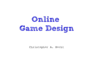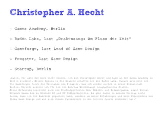 Das Dokument beschreibt die Erfahrungen und Perspektiven von Christopher A. Hecht im Game Design, einschließlich der Unterscheidung zwischen System- und Content-Design sowie der Notwendigkeit, Spielerlebnisse zu gestalten. Es wird auf die Herausforderungen eingegangen, die Monetarisierung im Game Design darzustellen, und wie dies oft zu einer schlechten Spielerfahrung führt. Hecht betont die Wichtigkeit, dass das Gameplay an erster Stelle stehen sollte, um qualitativ hochwertige Spiele zu entwickeln.