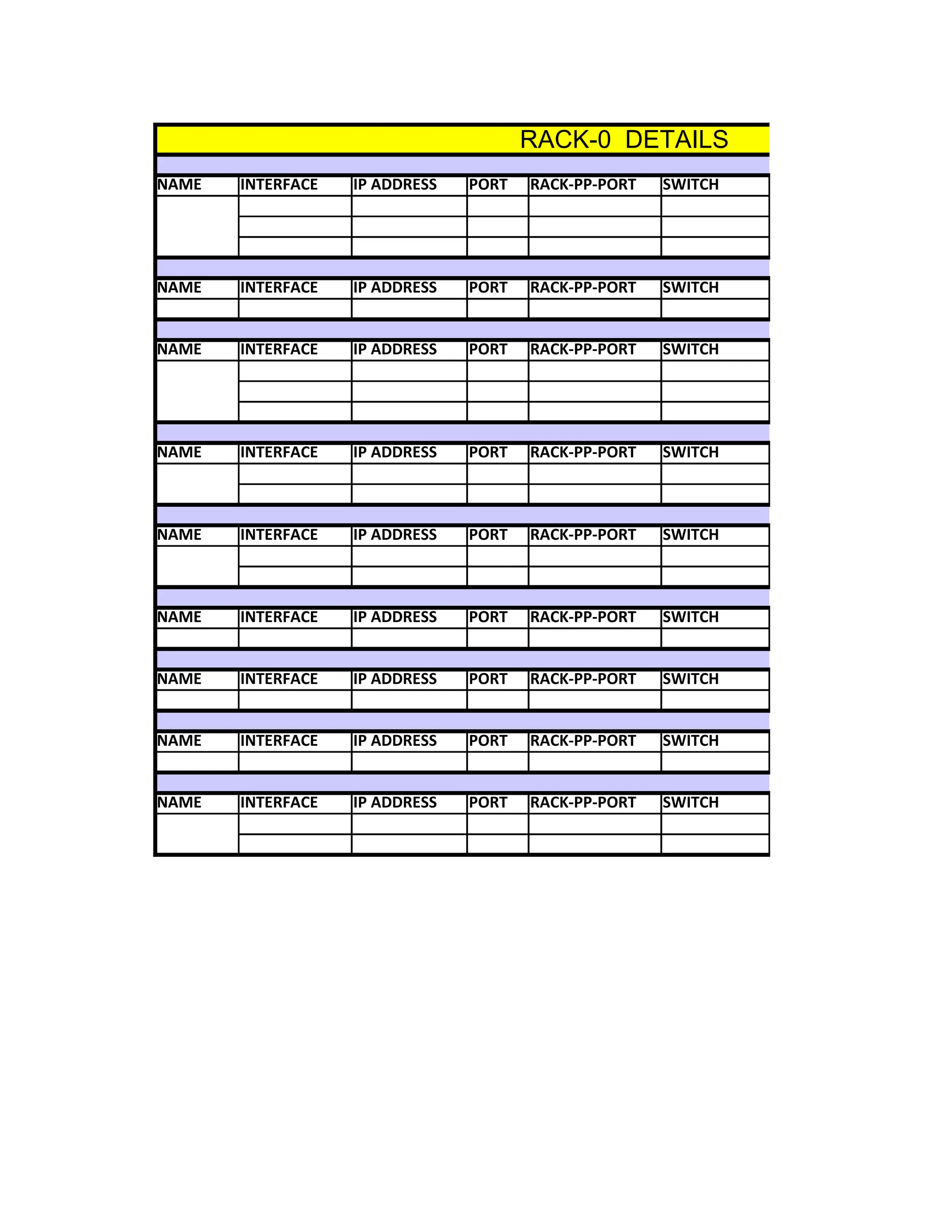 Das Dokument listet die Details von verschiedenen Racks und Serversystemen, einschließlich IP-Adressen, Ports und VLAN-IDs für zahlreiche Chassis und Blades. Jedes Rack wird spezifisch beschrieben, wobei die Schnittstellen und deren zugehörige Dienste aufgelistet sind. Zudem werden die Verbindungen zwischen den Racks und den verwendeten VLANs für die Netzwerkstruktur aufgezeigt.
