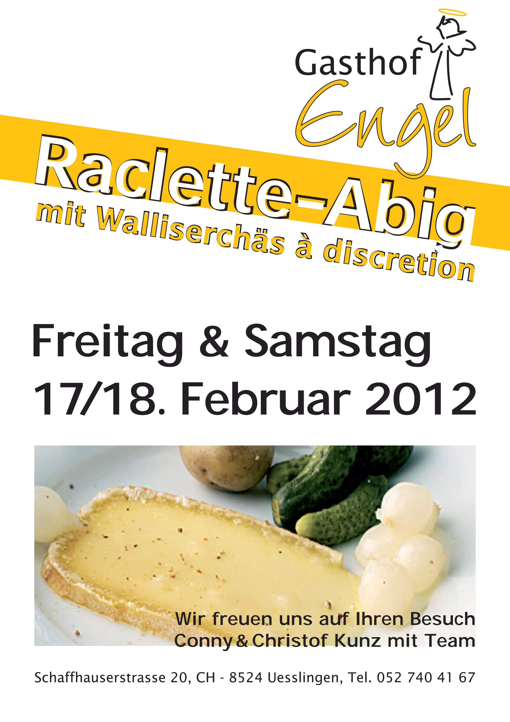 Am 17. und 18. Februar 2012 findet ein Raclette-Abend in Uesslingen statt. Die Veranstaltung wird von Conny und Christof Kunz sowie ihrem Team organisiert. Die Gäste sind herzlich eingeladen, teilzunehmen.