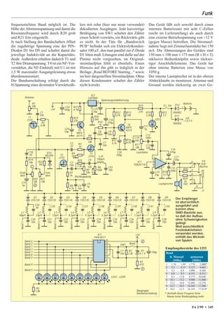 Das Dokument beschreibt den Bausatz 1253 von Ten-Tec, einen einfachen und preiswerten Kurzwellenempfänger mit elektronischer Bandumschaltung und einem ausgezeichneten NF-Verstärker. Es erläutert die technischen Details der Schaltung, die Funktionsweise des Rückkopplungsempfängers sowie Empfehlungen zur Handhabung und Montage des Geräts. Die Anleitung erlaubt auch ungeübten Benutzern den erfolgreichen Aufbau und die optimale Nutzung des Empfängers für den Empfang von Funkstationen auf verschiedenen Bändern.