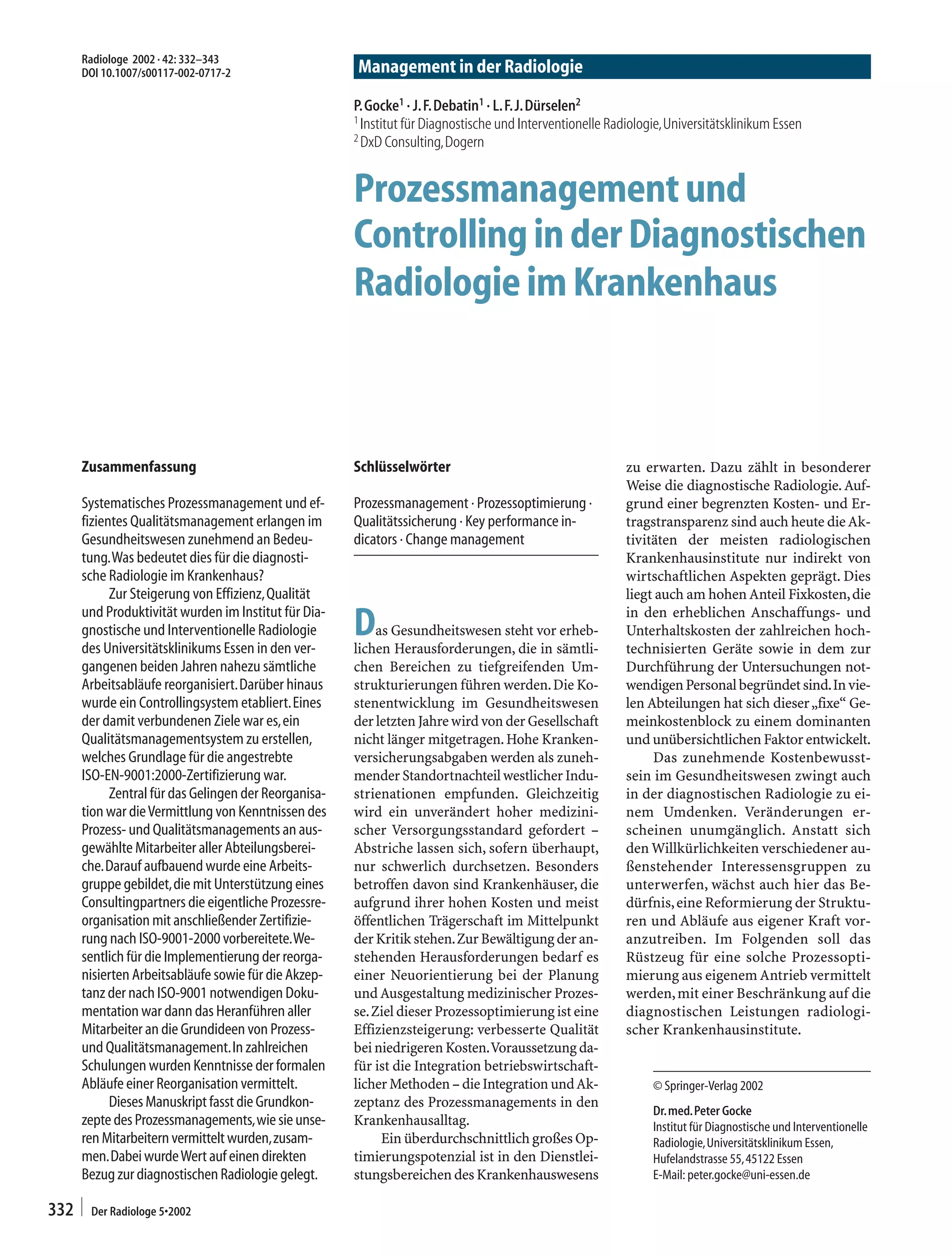 Das Dokument behandelt das Prozessmanagement und Qualitätskontrolle in der diagnostischen Radiologie, insbesondere im Kontext von Krankenhausstrukturen und den Herausforderungen, die durch steigende Kosten und den Bedarf an Effizienzsteigerung entstehen. Es wird beschrieben, wie ein Qualitätssicherungssystem etabliert wurde, um die aprobierten Standards (ISO 9001:2000) zu erreichen, und wie wichtige Prozesse in der Radiologie reorganisiert wurden, um die Qualität der Patientenversorgung zu verbessern. Zudem wird die wichtige Rolle der Überweiser als Kunden der radiologischen Dienstleistungen hervorgehoben, was eine kundenorientierte Sichtweise erfordert.