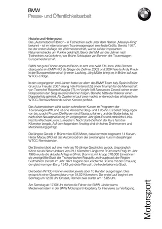 Die FIA World Touring Car Championship (WTCC) findet am 20./21. Juni 2009 in Brünn, Tschechien, statt, wo die BMW Länderteams nach einem Sieg in Valencia bestrebt sind, erneut an der Spitze zu konkurrieren. Alle Titelaspiranten treten mit dem gleichen Kompensationsgewicht an, was das Renngeschehen besonders spannend macht. Das Automotodrom Brno hat eine lange Geschichte im internationalen Tourenwagensport und gilt als anspruchsvoller Kurs mit technischen Herausforderungen.