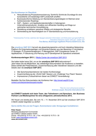 Die smart|con sap 2013 fand vom 11. bis 12. November 2013 in Berlin statt und zog mehr als 80 Teilnehmer aus 43 Unternehmen an, die in interaktiven Sessions bedeutende Herausforderungen und aktuelle Entwicklungen im Bereich SAP diskutierten. Die Konferenz bot eine Vielzahl von Formaten wie Vorträge, World Cafés und Roundtables, um den Erfahrungsaustausch zwischen den Teilnehmern zu fördern, und erhielt eine Gesamtnote von 1,4 von den Teilnehmern. Die Veranstaltung wurde als erfolgreiche Networking-Plattform für Entscheidungsträger und Experten im IT-Bereich angesehen und wird 2014 fortgesetzt.