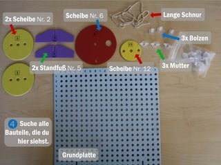 Die Anleitung beschreibt den Zusammenbau eines Seilzugs aus verschiedenen Bauteilen wie Scheiben, Bolzen und einer Schnur. Die Schritte umfassen das Zusammenfügen der scheibenförmigen Bauteile, das Anbringen einer Schnur und das Fixieren der Teile auf einer Grundplatte. Am Ende wird erklärt, wie das Gewicht mithilfe des Seilzugs angehoben werden kann.