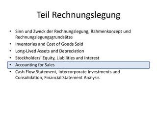 Das Dokument behandelt die Rechnungslegung im Kontext von Controlling und den relevanten Rahmenbedingungen, einschließlich des Sarbanes-Oxley-Gesetzes zur internen Kontrolle und der Neufassung des Revisionsrechts. Besonders hervorgehoben werden die Kriterien zur Umsatzerfassung sowie die Behandlung langfristiger Fertigungsaufträge und deren Bilanzierungsmethoden, inklusive der 'completed contract'- und 'percentage of completion'-Methoden. Zudem wird auf die Analyse von Forderungen und die Bewertung von Finanzinstrumenten eingegangen.