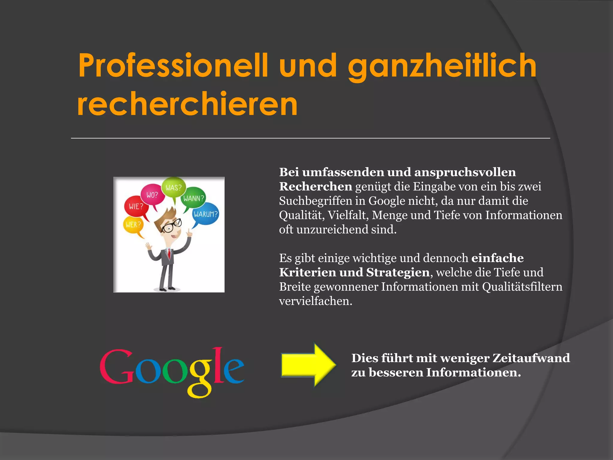 Das Dokument beschreibt die Anforderungen an umfassende und qualitativ hochwertige Recherchen, die über einfache Google-Suchanfragen hinausgehen. Es bietet systematische Strategien zur Verbesserung der Rechercheergebnisse durch gezielte Keyword-Nutzung, die Wahl geeigneter Informationsquellen und die Berücksichtigung verschiedener Medienformate. Zudem werden die Bedeutung der Informationsqualität und die Vorteile von klassischen sowie digitalen Quellen in der Recherche hervorgehoben.