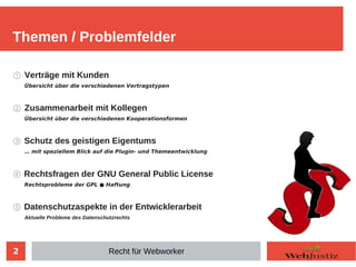 Das Dokument behandelt rechtliche Implikationen für Webworker, insbesondere hinsichtlich der verschiedenen Vertragstypen bei Kundenbeziehungen, der Zusammenarbeit mit Kollegen sowie dem Schutz des geistigen Eigentums. Es werden wichtige Aspekte wie Vertragsschluss, Preisvereinbarungen, Haftung und Urheberrecht im Kontext von Software-Entwicklung, insbesondere bei Plugins und Themes, angesprochen. Zudem werden Fragen zur Kooperation und den damit verbundenen rechtlichen Gegebenheiten thematisiert.