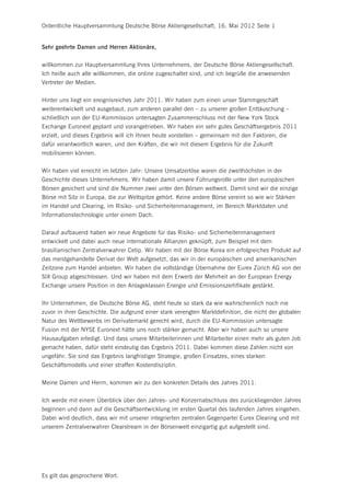 Dr. Reto Francioni, Vorstandsvorsitzender der Deutschen Börse AG, begrüßt die Aktionäre zur Hauptversammlung am 16. Mai 2012 und reflektiert über ein ereignisreiches Jahr 2011, in dem das Unternehmen trotz des von der EU-Kommission untersagten Zusammenschlusses mit der NYSE Euronext bemerkenswerte Geschäftsergebnisse erzielte. Die Nettoerlöse stiegen auf 2,1 Milliarden Euro, und der bereinigte Konzernjahresüberschuss betrug 833 Millionen Euro, was einen Anstieg von 15 Prozent im Vergleich zum Vorjahr darstellt. Trotz der Herausforderungen schaffte es die Deutsche Börse, durch eine konsequente Wachstumsstrategie und straffes Kostenmanagement ihre Marktposition zu festigen und weiter auszubauen.