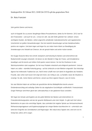 Die Bilanzpressekonferenz der Deutschen Börse AG beschreibt die Herausforderungen des Finanzsektors im Jahr 2012, einschließlich anhaltender wirtschaftlicher Unsicherheiten und regulatorischer Veränderungen. Trotz dieser Rückschläge konnte das Unternehmen verschiedene strategische Initiativen umsetzen und neue Produkte entwickeln, um Wachstum zu fördern, hauptsächlich in den aufstrebenden Märkten Asiens. Im Jahr 2013 plant die Deutsche Börse, ihre Investitionen zu erhöhen und ihre Dienstleistungen in unregulierte Märkte auszuweiten, um ihre Wettbewerbsfähigkeit zu sichern und das Wachstum zu maximieren.