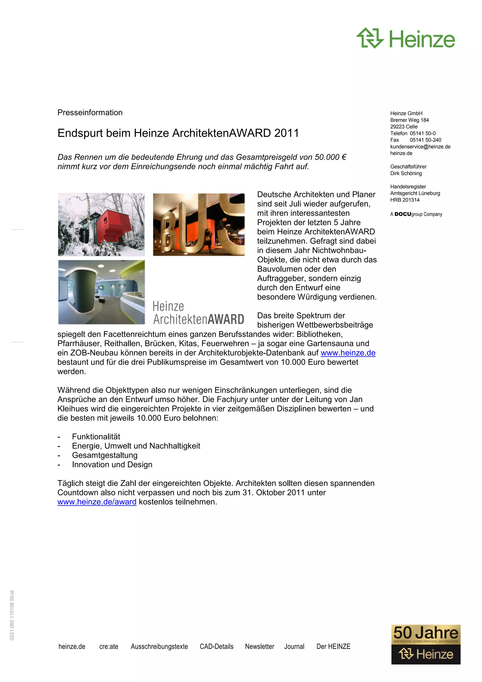 Der Heinze Architektenaward 2011 bietet ein Preisgeld von 50.000 € und ermutigt Architekten, bis zum 31. Oktober 2011 ihre Projekte aus den letzten fünf Jahren einzureichen. Bewertet werden die Einsendungen unter anderem in den Kategorien Funktionalität, Nachhaltigkeit und Design durch eine Fachjury. Die öffentliche Bewertung umfasst drei Preise im Gesamtwert von 10.000 € für die beliebtesten Projekte.