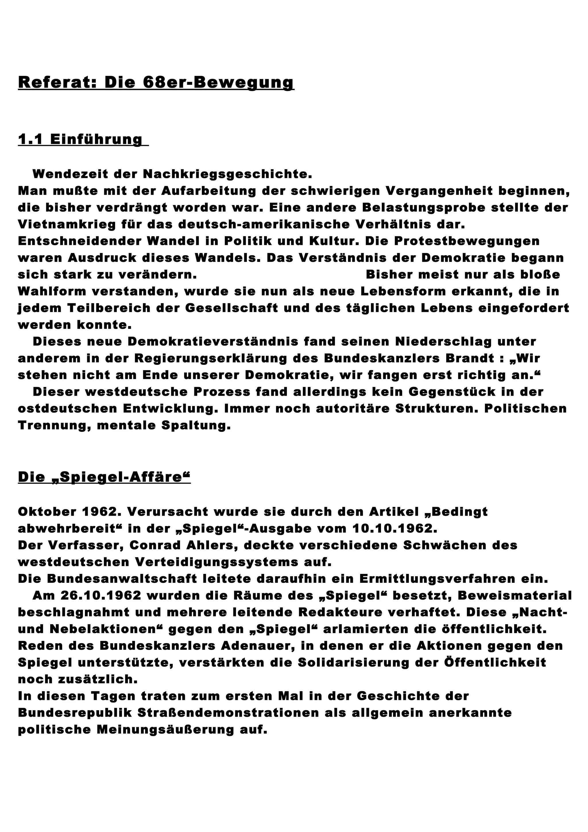Die 68er-Bewegung war eine Zeit des Wandels in Deutschland, die sich sowohl politisch als auch kulturell manifestierte und ein neues Verständnis von Demokratie hervorbrachte. Proteste, besonders gegen den Vietnamkrieg und die Notstandsgesetze, führten zur Bildung einer außerparlamentarischen Opposition und markierten den Höhepunkt der Studentenbewegung, die jedoch in den Folgejahren auseinanderbrach. Die Bewegung hinterließ bleibende Spuren, darunter die Frauenbewegung, Hochschulreformen und die politische Umorientierung vieler Aktivisten.