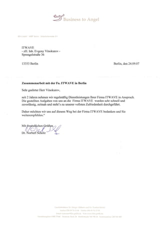 Herr Evgeny Vinokurov war vom 01.10.2007 bis zum 31.03.2010 als freiberuflicher System-Netzwerkadministrator bei Novent Concepts tätig, wo er umfassende IT-Dienstleistungen für mittelständische Unternehmen in Berlin und Brandenburg erbrachte. Zu seinen Aufgaben gehörten die Installation und Konfiguration von Servern und Netzwerken sowie die Wartung und Betreuung von Firmennetzwerken in verschiedenen Branchen, wobei er durch hohe Zuverlässigkeit und Selbstständigkeit überzeugte. Die Zusammenarbeit endete auf Wunsch von Herrn Vinokurov sowie aufgrund der verschlechterten Auftragslage, und ihm wurde für seine hervorragende Arbeit gedankt.