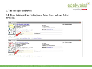 Das Dokument beschreibt die Funktionen der Haranberg Kommunikation Plattform, einschließlich der Anleitungen zum Einordnen und Anzeigen von Titeln in Regalen. Benutzer können Titel in Kategorien einfügen, ihre Regale einsehen und die Regale von Freunden in der Community erkunden. Bei Fragen oder Problemen wird die Kontaktinformation für den Support bereitgestellt.