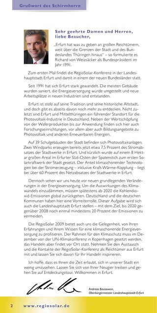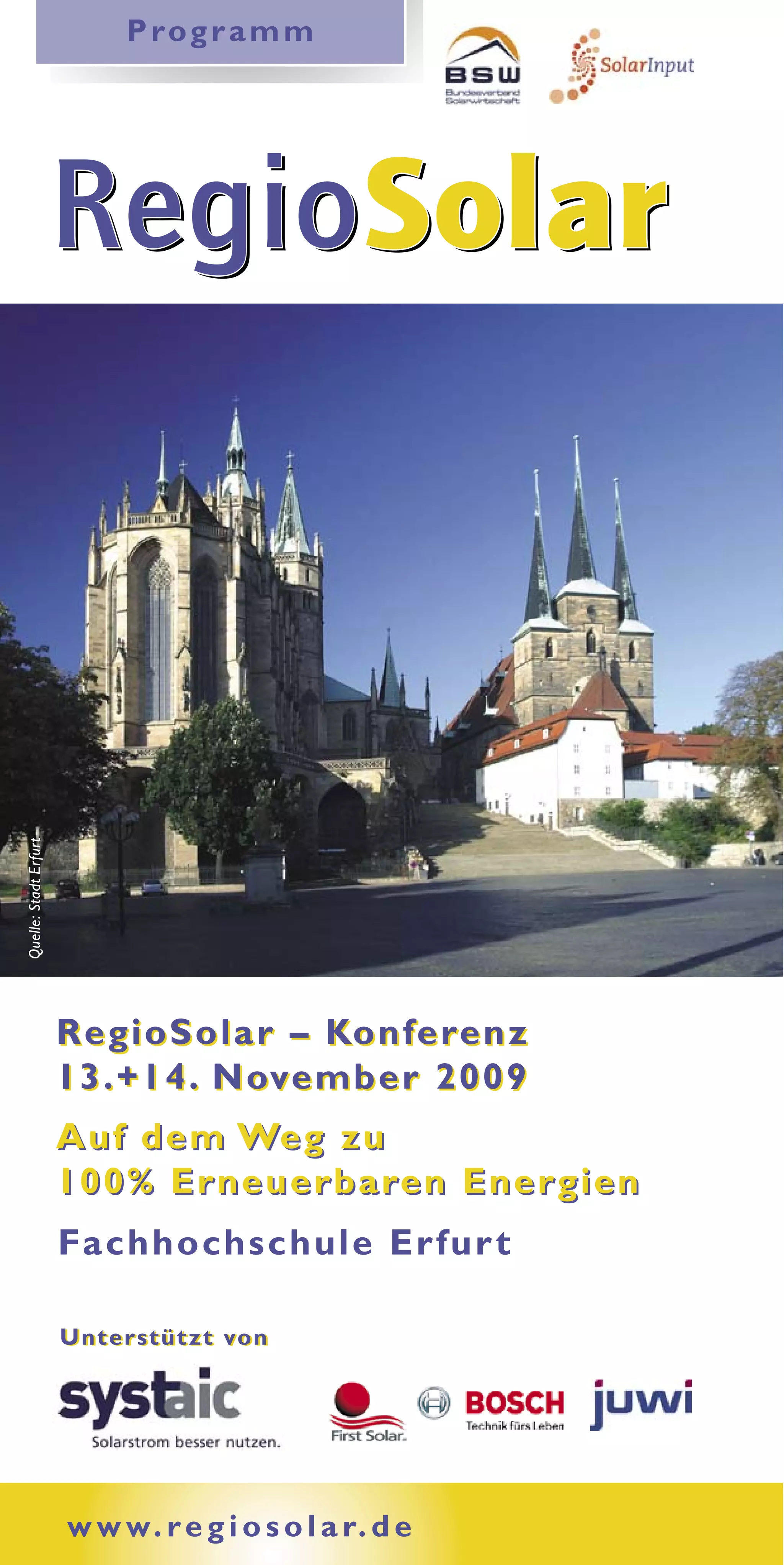 Die Regiosolar-Konferenz 2009 in Erfurt behandelt die Herausforderungen und Chancen der Energiewende hin zu 100% erneuerbaren Energien, wobei der Fokus auf der Förderung von Photovoltaik und anderen erneuerbaren Technologien liegt. Die Veranstaltung bietet eine Plattform für den Austausch zwischen Entscheidungsträgern, Initiativen und Experten aus Politik, Wirtschaft und Bildung, um innovative Konzepte zu diskutieren und zu entwickeln. Erfurt konnte bereits signifikante Fortschritte in der Energieversorgung und -effizienz verzeichnen und plant, bis 2020 die Kohlendioxid-Emissionen deutlich zu reduzieren.