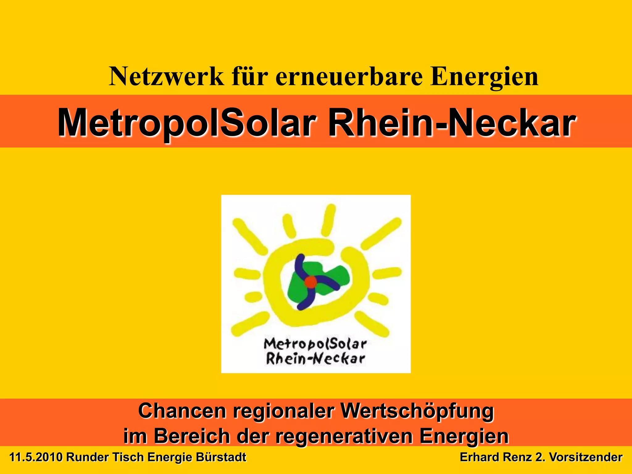 Das Dokument informiert über die Chancen der regionalen Wertschöpfung im Bereich der erneuerbaren Energien im Rhein-Neckar-Gebiet. Es werden lokale Initiativen und Akteure genannt, die sich für die Förderung erneuerbarer Energien einsetzen. Zudem wird auf die finanziellen Aspekte eingegangen, die mit dem Energieeinkauf im Ausland verbunden sind.