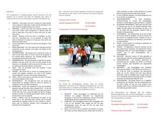 Das Dokument enthält die Regeln und Vorschriften für den Aufenthalt im Camping Aquileia, einschließlich Ankunftszeiten, Ruhezeiten, Hygienevorschriften und Verantwortlichkeiten der Gäste. Es wird betont, dass ein respektvolles Verhalten gegenüber anderen Gästen und die Einhaltung der Regeln für einen angenehmen Aufenthalt unerlässlich sind. Bei Nichteinhaltung der Vorschriften behält sich die Direktion das Recht vor, Maßnahmen zu ergreifen, bis hin zu einer möglichen Entfernung des Gastes.