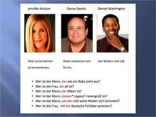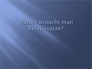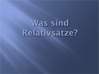 Relativsätze geben zusätzliche Informationen zu Substantiven und verbessern die Satzstruktur. Sie hängen von der Kasusform ab und ersetzen Pronomen in verschiedenen grammatischen Zusammenhängen. Zudem werden spezielle Hinweise zur Verwendung von Wörtern wie 'wer' und 'was' in Relativsätzen gegeben.