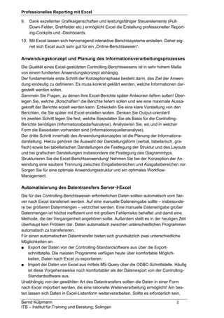 Das Dokument beschreibt zehn Schritte zur Erstellung eines professionellen Controlling-Reporting-Systems mit Excel, einschließlich der Nutzung von Pivot-Tabellen, automatischem Datentransfer und leistungsfähigen Formeln. Es betont die Bedeutung eines fundierten Anwendungskonzepts und die optimale Ausschöpfung von Excels Möglichkeiten für das Berichtswesen. Abschließend wird hervorgehoben, dass Excel in der Lage ist, ein effizientes und professionelles Reporting zu unterstützen, das auch hohen Ansprüchen gerecht wird.