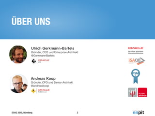 Die Präsentation von Ulrich Gerkmann-Bartels und Andreas Koop bei der DOAG 2015 in Nürnberg behandelt Architekturen und Prinzipien des REST-Designs unter Verwendung von Technologien wie Oracle ORDS, Node.js, ADF und Plain Java. Sie stellen die Vor- und Nachteile verschiedener Ansätze dar und empfehlen kombinierte Architekturen zur Optimierung von Cloud- und Mobile-Anwendungen. Abschließend wird betont, dass REST-APIs eine entscheidende Rolle in der technischen Architektur von Softwaresystemen spielen und möglicherweise ergänzende Infrastruktur benötigen.