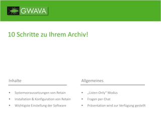 Das Dokument beschreibt die zehn Schritte zur Implementierung eines Archivierungssystems mit der Software Retain, einschließlich Hardware-Anforderungen, Betriebssystem-Setup, Datenbankkonfiguration und allgemeinen Einstellungen. Es bietet eine Übersicht über die Installation, die erforderlichen Module und die Archivierungsprozesse. Thomas Stegemann von GWAVA EMEA GmbH bietet Unterstützung und Ressourcen wie Testversionen und Web-Demos an.