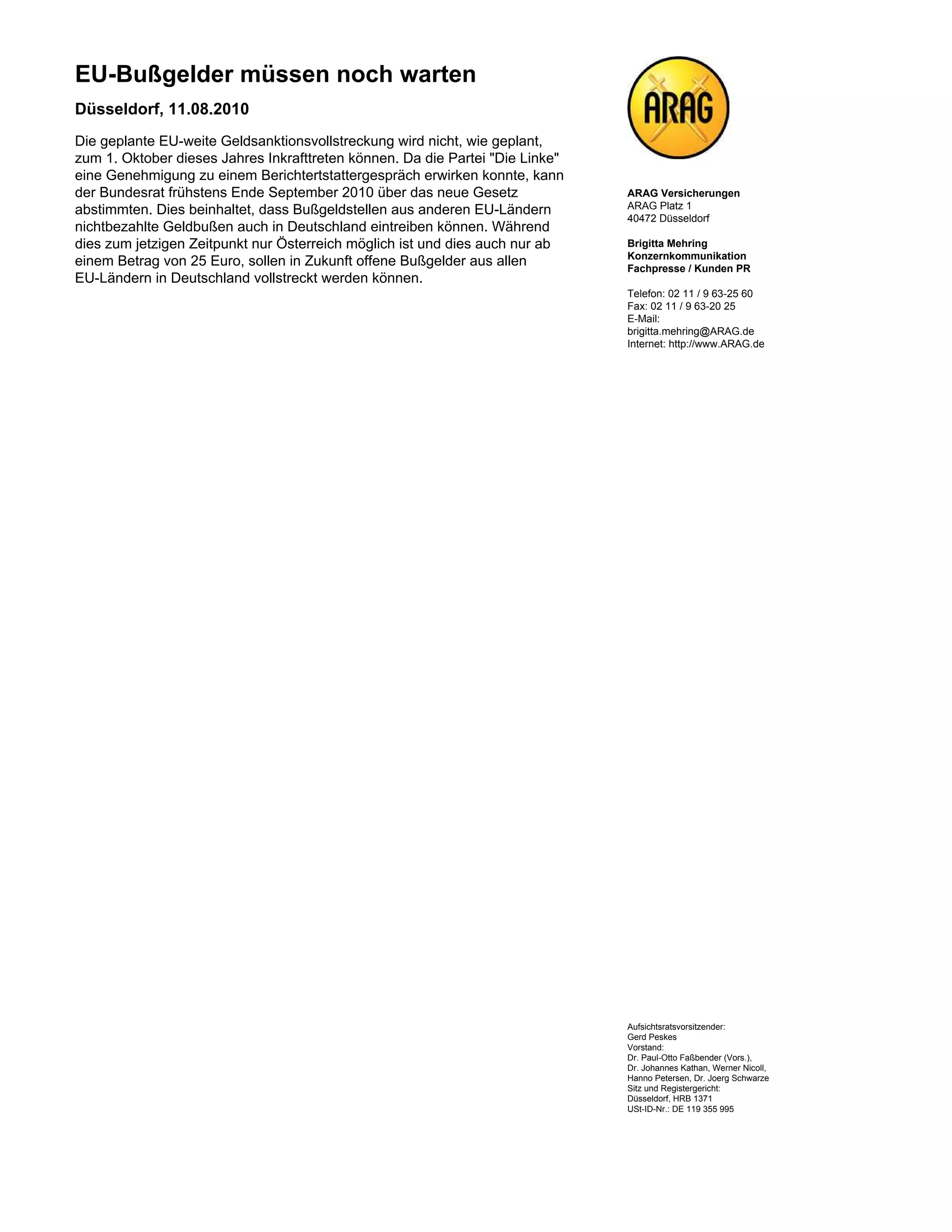 Die geplante EU-weite Geldsanktionsvollstreckung kann nicht wie vorgesehen zum 1. Oktober 2010 in Kraft treten, da die Partei 'Die Linke' ein Berichterstattergespräch erwirken konnte. Der Bundesrat wird frühestens Ende September 2010 über das neue Gesetz abstimmen, das die Eintreibung von Bußgeldern aus anderen EU-Ländern in Deutschland ermöglichen soll. Aktuell ist dies nur für Österreich ab Beträgen von 25 Euro möglich.