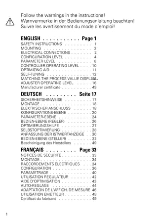 Das Dokument enthält Bedienungsanleitungen für einen Industrie-Controller, einschließlich Sicherheitsanweisungen, Montage-, Anschluss- und Konfigurationsdetails. Es beschreibt verschiedene Betriebs- und Parameterlevel sowie deren Anpassung und Funktionsweisen, einschließlich der Optimierungshilfen und Selbstoptimierung. Zudem werden elektrische Anschlüsse, technische Daten und spezifische Konfigurationscodes erläutert.