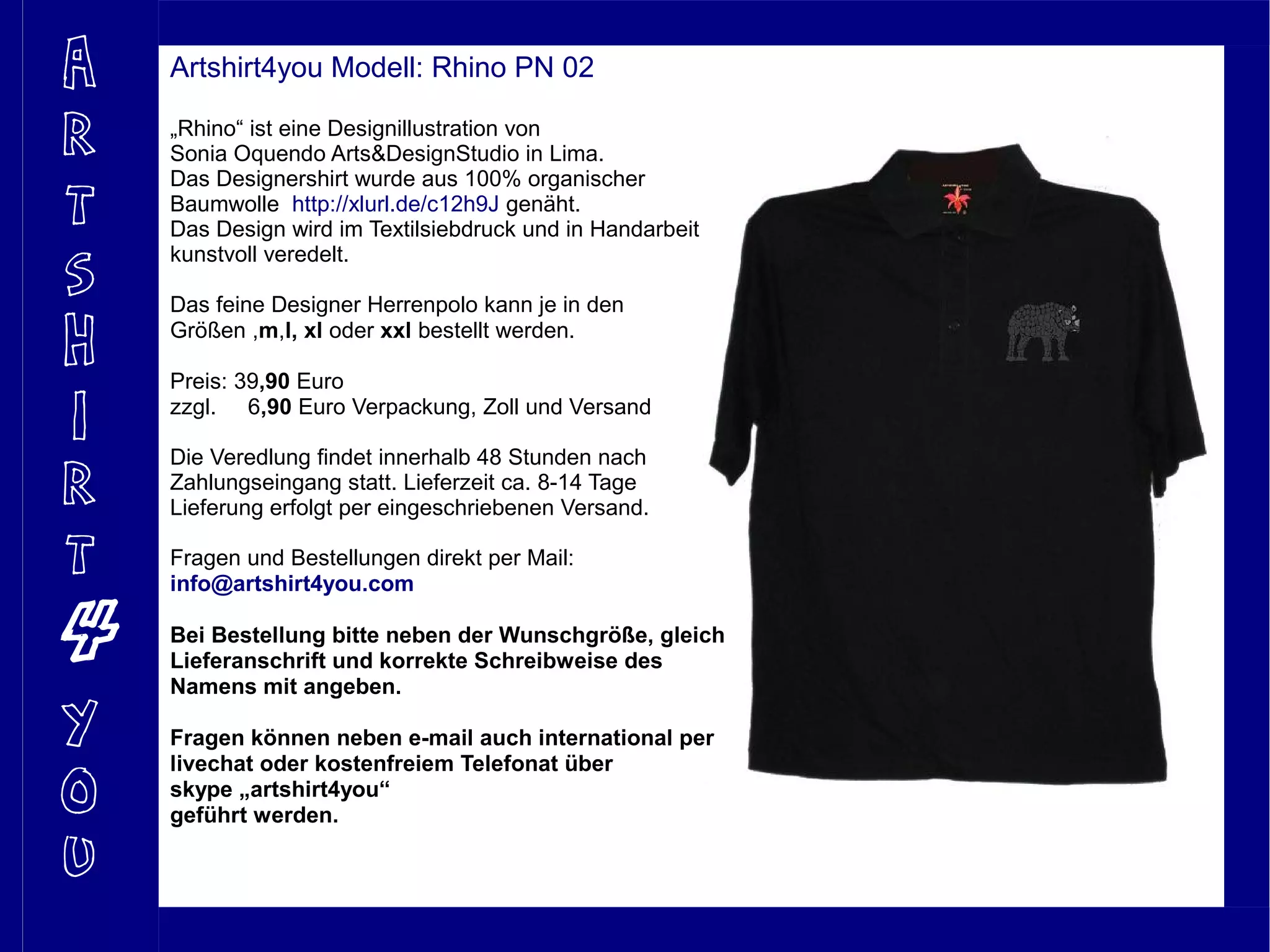 Das Dokument beschreibt ein Designer-Herrenpolo namens 'Rhino', entworfen von Sonia Oquendo, das aus 100% organischer Baumwolle gefertigt und im Textilsiebdruck veredelt wird. Das Shirt ist in verschiedenen Größen erhältlich und kostet 39,90 Euro zuzüglich Versandkosten, mit einer Lieferzeit von 8-14 Tagen nach Zahlungseingang. Bestellungen und Anfragen können per E-Mail oder über Live-Chat und Skype aufgegeben werden.