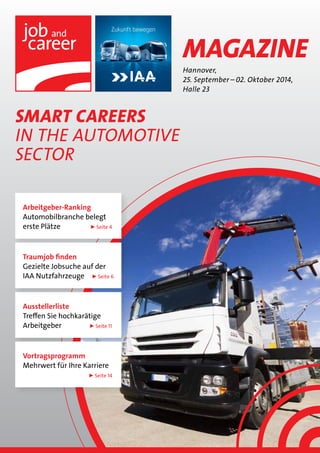 Die Veranstaltung "Job and Career at IAA Nutzfahrzeuge" in Hannover bietet eine Plattform für Bewerber, um mit führenden Arbeitgebern der Automobilindustrie in Kontakt zu treten und Informationen zu Karrierechancen zu erhalten. Die Automobilbranche ist in Deutschland besonders beliebt bei Hochschulabsolventen, die attraktive Arbeitgeber wie Audi, BMW, Porsche und VW schätzen, und die Branche verzeichnet ein positives Wachstum mit über 767.000 Arbeitnehmern. Zudem werden gezielte Unterstützungsmöglichkeiten wie ein Jobportal und multimediale Jobwalls bereitgestellt, um den Jobwechsel und die Karriereplanung zu erleichtern.