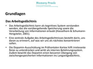 Das Dokument behandelt das Arbeitsgedächtnistraining mit dem Programm Robomemo, das für Kinder und Jugendliche mit ADHS entwickelt wurde. Kognitive Trainingsmethoden zeigen, dass sich die Arbeitsgedächtniskapazität durch gezieltes Training verbessern lässt, was positive Auswirkungen auf Aufmerksamkeit und Konzentration hat. Eine Elternbefragung zeigt, dass viele Kinder nach dem Training Fortschritte in Bezug auf Aufmerksamkeit und Impulsivität aufweisen.
