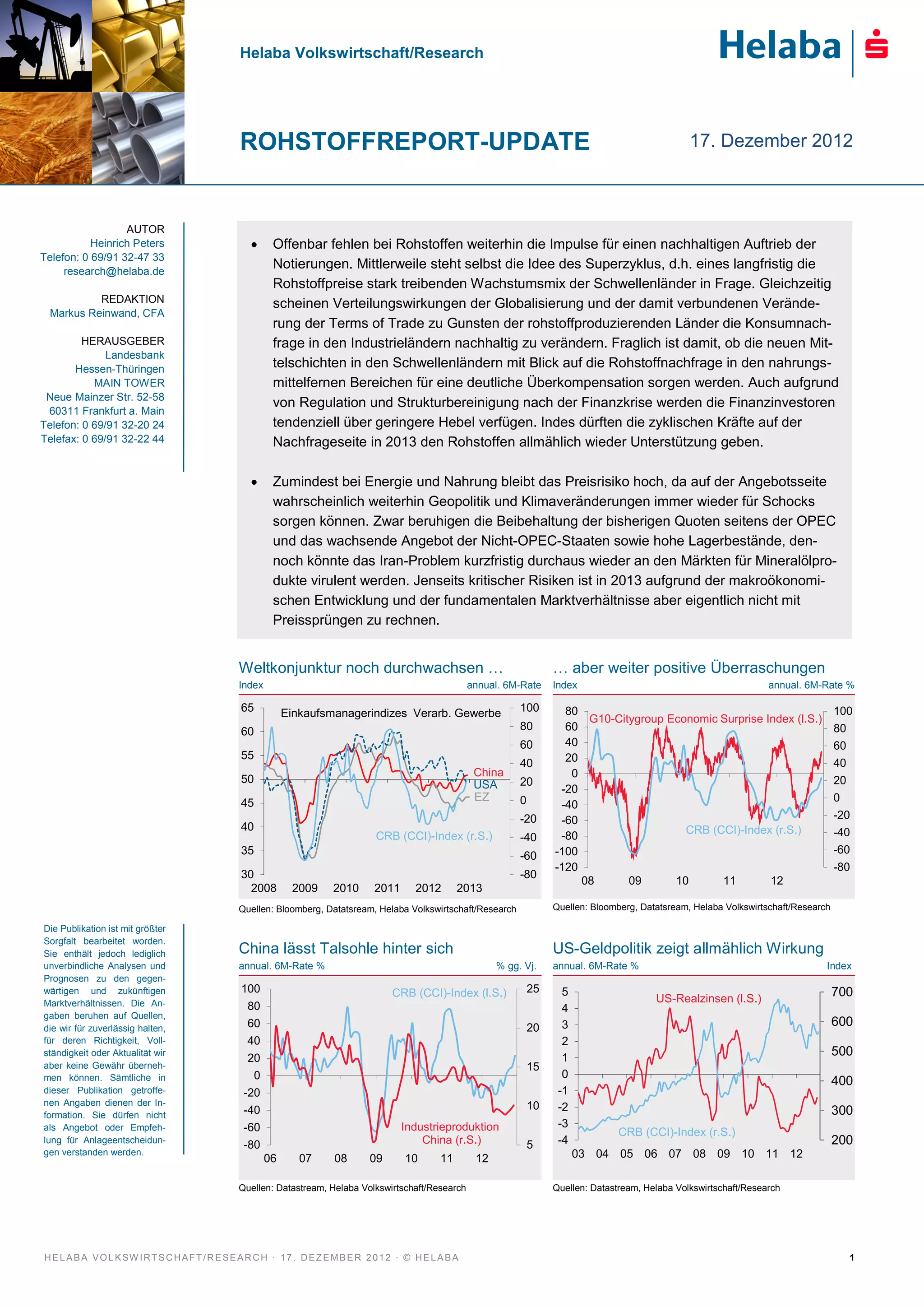 Der Rohstoffreport vom Dezember 2012 analysiert die anhaltende Schwäche bei Rohstoffpreisen und hinterfragt die Vorstellung eines Superzyklus, während geopolitische und klimatische Risiken weiterhin das Preisrisiko hochhalten. Es wird auf eine allmähliche Unterstützung der Rohstoffe durch zyklische Nachfragesteigerungen in 2013 hingewiesen, gleichzeitig bleibt die Zukunft unsicher. Insbesondere die Energiemärkte könnten durch Angebot-Überhänge und geopolitische Spannungen, wie im Iran, beeinflusst werden.