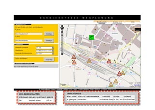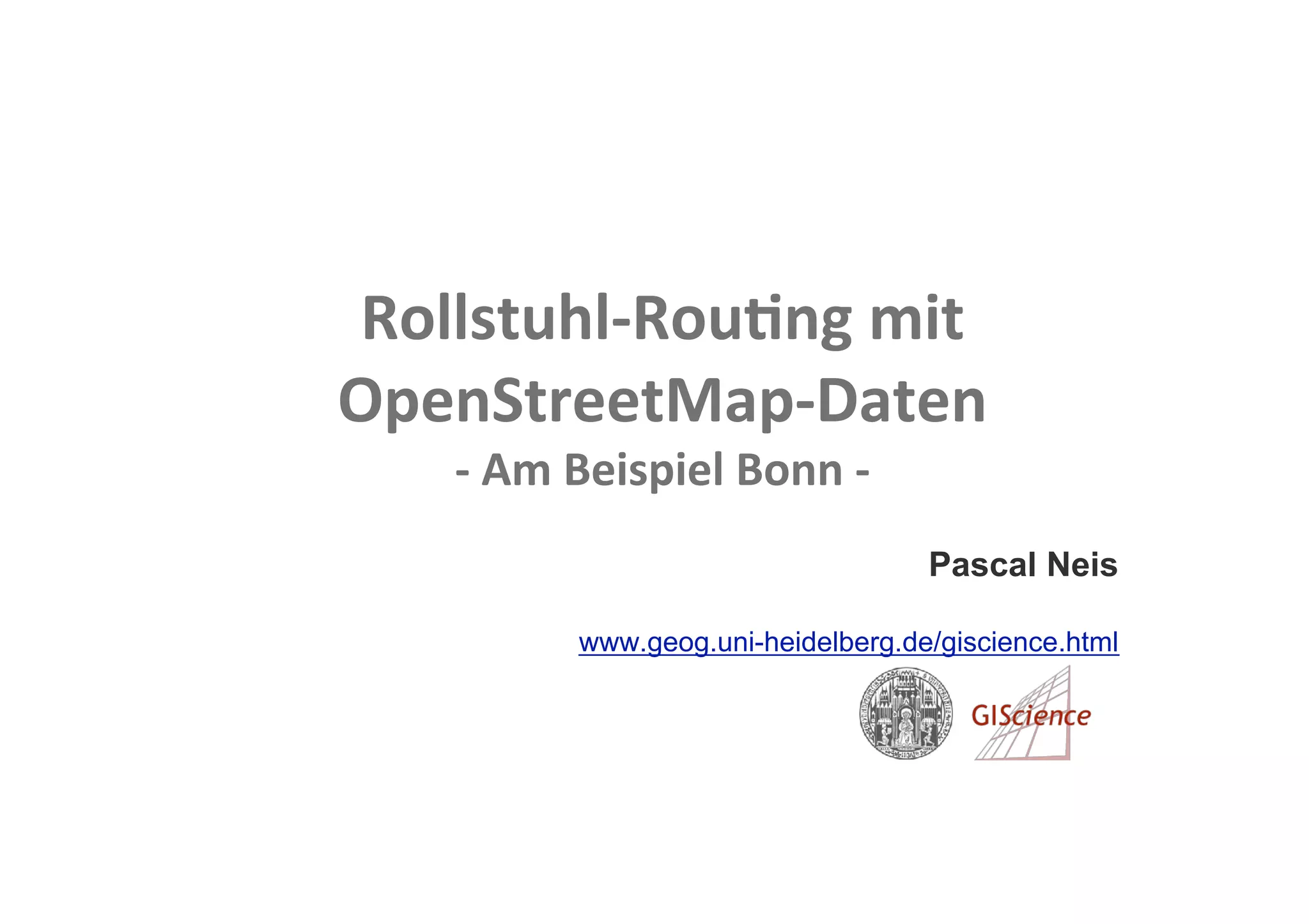 Das Dokument befasst sich mit der Nutzung von OpenStreetMap-Daten zur Erstellung von rollstuhlgerechten Routen in Bonn, um Menschen mit Mobilitätseinschränkungen den Alltag zu erleichtern. Es werden spezifische Anforderungen an Oberflächenbeschaffenheit, Steigung und Wegebreite genannt. Zusätzlich werden Kontakte und Links zu relevanten Informationen und Projekten bereitgestellt.