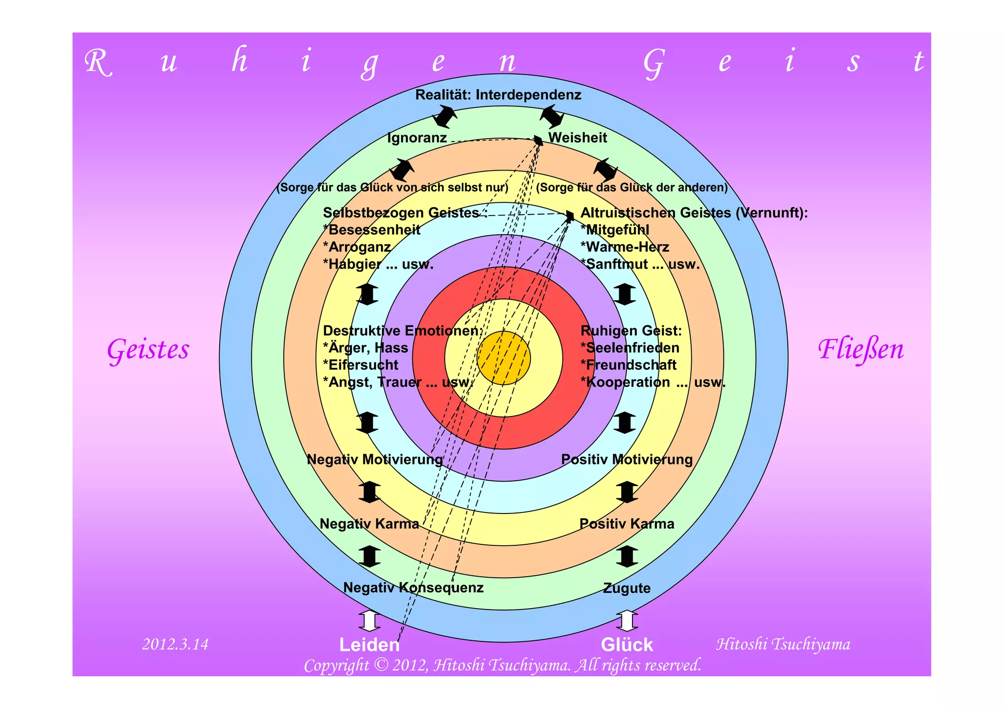 Das Dokument behandelt die Konzepte eines ruhigen Geistes, der innere Stärke und Weisheit repräsentiert, sowie dessen positive Effekte auf Gesundheit und Lebensqualität. Es werden Methoden zur Erlangung und Transformation des Geistes beschrieben, einschließlich der Kontrolle über destruktive Emotionen und der Förderung altruistischer Eigenschaften wie Mitgefühl. Zudem wird die Bedeutung der interdependenten Realität hervorgehoben, um ein erfülltes und glückliches Leben zu führen.