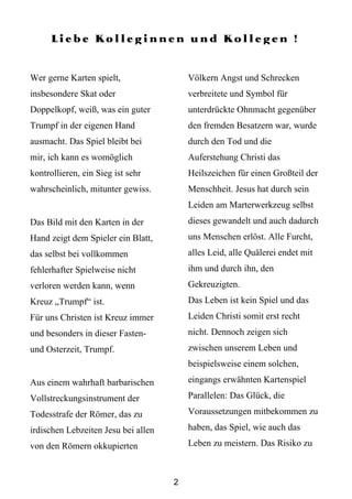 Der Rundbrief der Gemeindereferenten im Bistum Essen zu Ostern 2012 thematisiert die Bedeutung des Kreuzes als 'Trumpf' für Christen, der durch die Auferstehung Jesu Hoffnung und Erlösung symbolisiert. Er kündigt mehrere Veranstaltungen an, darunter den Diözesantag und den Weltgebetstag für geistliche Berufe, und verweist auf Angebote zur geistlichen Begleitung sowie die Bedeutung von Dialogprozessen innerhalb der Kirche. Zudem werden Materialien zur Gestaltung von Gottesdiensten und Veranstaltungen im Zusammenhang mit der Berufungspastoral vorgestellt.