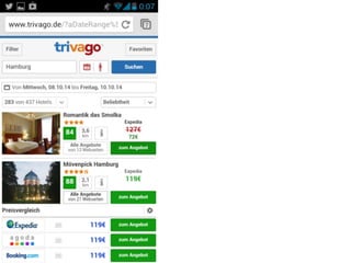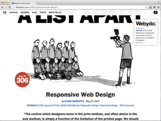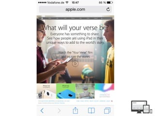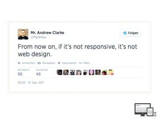 Das Dokument erörtert verschiedene Ansätze des Responsive Webdesigns, darunter den klassischen Ansatz mit separaten Desktop- und mobilen Seiten und den responsiven Ansatz, der eine einzige Website beinhaltet, die sich automatisch an verschiedene Bildschirmgrößen anpasst. Es werden technische Aspekte wie flexible Layouts, Media Queries und die Bedeutung der Benutzererfahrung hervorgerufen, während auch die Grenzen des responsiven Designs thematisiert werden. Zudem wird empfohlen, eine mobile Strategie zu entwickeln, die über ein reines responsives Design hinausgeht, um die Benutzerzufriedenheit zu optimieren.
