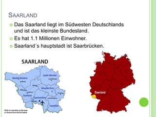 Das Saarland, Deutschlands kleinstes Bundesland mit etwa 1,1 Millionen Einwohnern, liegt im Südwesten des Landes und hat Saarbrücken als Hauptstadt. Bekannte Persönlichkeiten sind der Kabarettist Gerd Dudenhöffer und die Sängerin Nicole Hohloch, die 1982 den Eurovision Song Contest gewann. Zu den Sehenswürdigkeiten zählen die Saarschleife, die Ludwigskirche und der Gollenstein, der größte Hinkelstein Mitteleuropas.