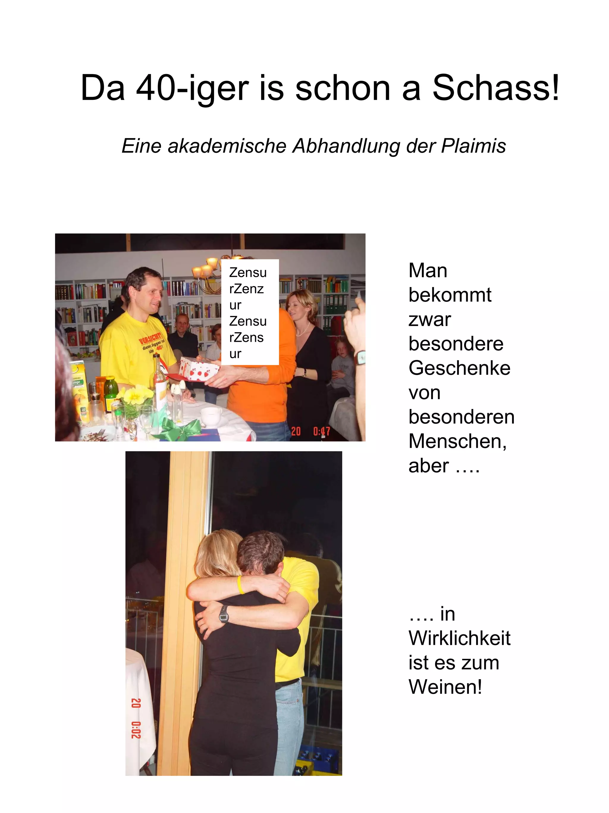 Das Dokument behandelt auf humorvolle Weise die Herausforderungen des Alterns und die damit verbundenen gesellschaftlichen Wahrnehmungen. Es thematisiert den Frust über körperliche Veränderungen, den Einfluss von Alkohol und Sport sowie die damit einhergehenden Selbsthilfemaßnahmen. Zudem gibt es ironische Kommentare zu Geschlechterunterschieden im Alterungsprozess und der gleichgeschlechtlichen Liebe.