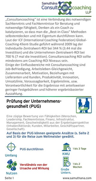 Das Dokument beschreibt die Vorteile des Consultancoachings für kleine und mittelständische Unternehmen (KMU) und große Unternehmen, einschließlich einer detaillierten Analyse der ROI-Werte. Es erläutert verschiedene Coaching-Methoden, die auf Selbstentdeckung von Ansätzen abzielen, um die Effizienz, Zusammenarbeit und Produktivität in Organisationen zu verbessern. Zudem werden strategische Prozesse zur Zielentwicklung und deren Umsetzung zur Steigerung der Unternehmensleistung vorgestellt.