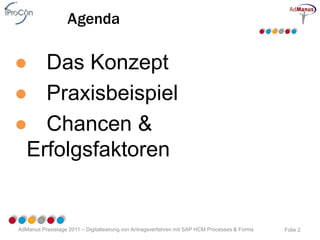 Das Dokument behandelt die Digitalisierung von Antragsverfahren mit SAP HCM Processes & Forms, um die Effizienz und Datenqualität in der Personalwirtschaft zu verbessern. Es werden ein Konzept, ein Praxisbeispiel sowie Chancen und Erfolgsfaktoren für die Implementierung aufgezeigt. Kritische Erfolgsfaktoren wie die frühzeitige Einbeziehung von Führungskräften und die Evaluierung von Lizenzkosten werden hervorgehoben.