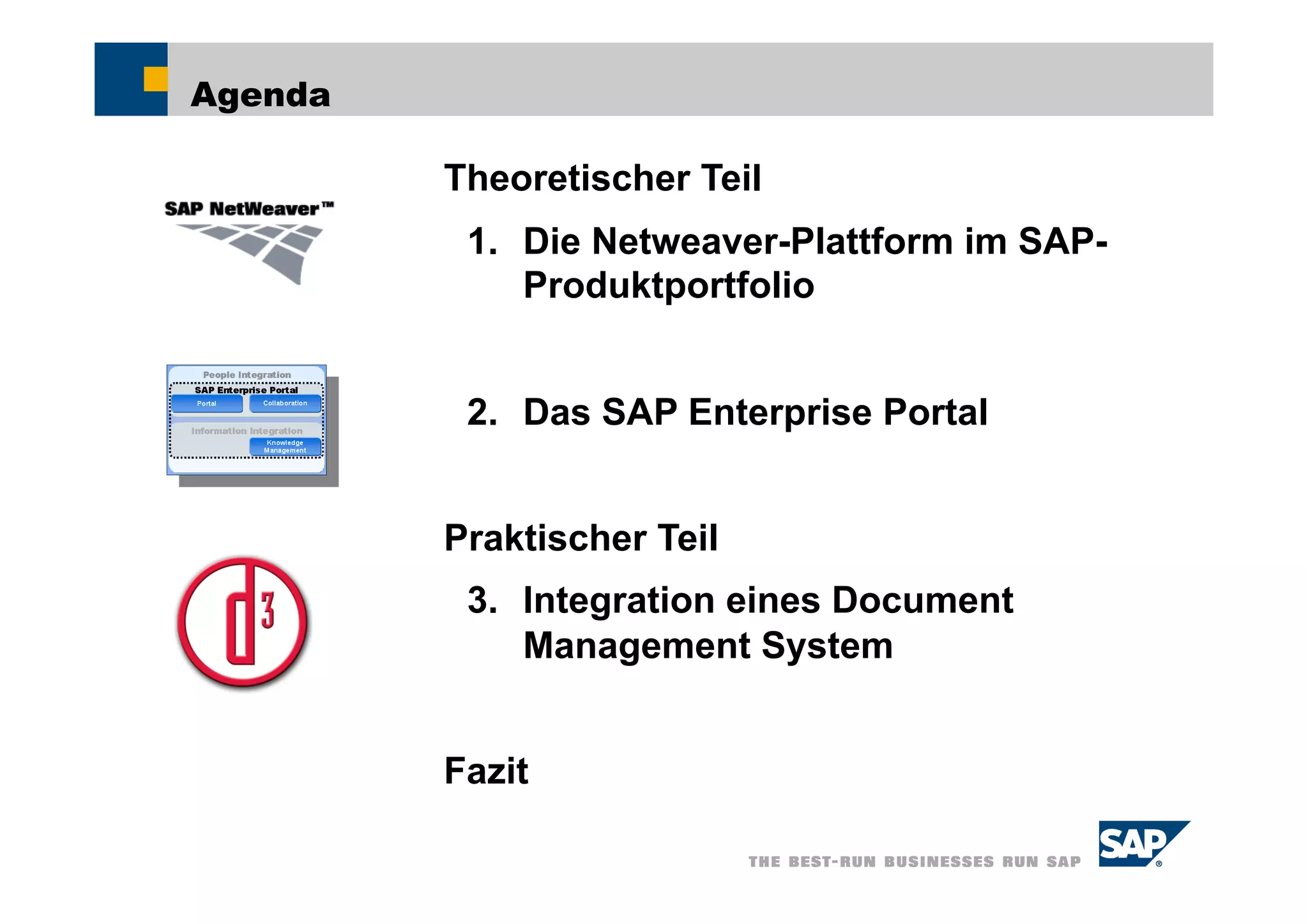 Das Dokument beschreibt die NetWeaver-Plattform im SAP-Produktportfolio als Middleware-Technologie, die Integration und Applikationsausführung ermöglicht und auf offenen Standards basiert. Außerdem wird das SAP Enterprise Portal als zentrale Plattform für den Zugriff auf Informationen und Dienste vorgestellt, die erweiterbare, benutzerfreundliche Oberflächen bietet und Collaboration sowie Knowledge Management unterstützt. Schließlich wird die Integration eines Dokumentenmanagementsystems behandelt, das den Workflow optimiert und die Effizienz erhöht.