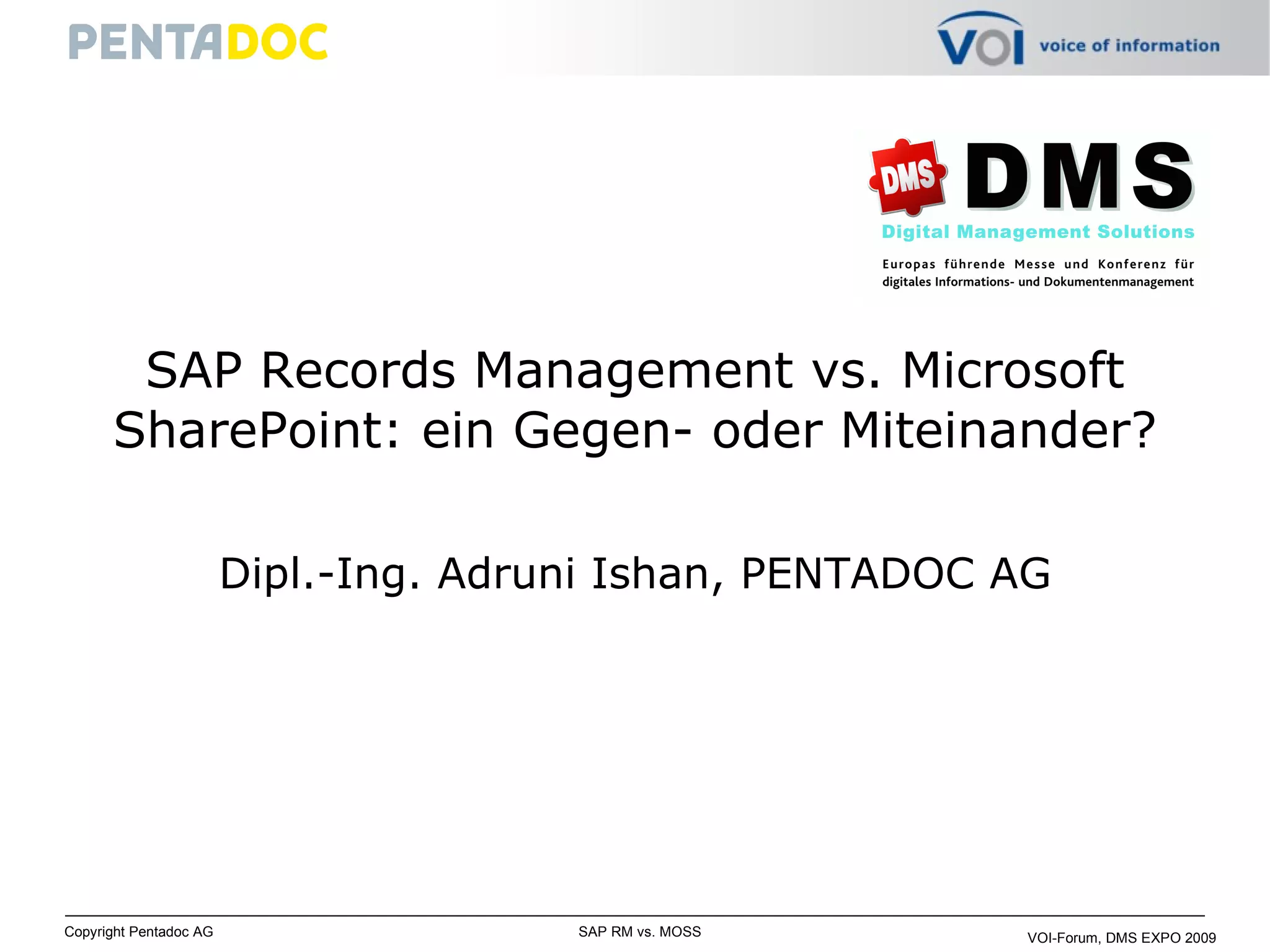 Das Dokument vergleicht SAP Records Management und Microsoft SharePoint hinsichtlich der Optimierung dokumentbezogener Geschäftsprozesse. Beide Systeme bieten Funktionen zur Dokumentenverwaltung und zur Automatisierung von Arbeitsabläufen in einer integrierten Arbeitsumgebung, wobei SAP Records Management eine zentrale Sicht auf alle relevanten Informationen und Transaktionen ermöglicht, während SharePoint flexible Dokumentbibliotheken und integrierte Funktionen für die Datensatzverwaltung bietet. Eine hybride Lösung, die beide Systeme kombiniert, kann den unterschiedlichen Anforderungen in zentralen und dezentralen Organisationseinheiten gerecht werden.
